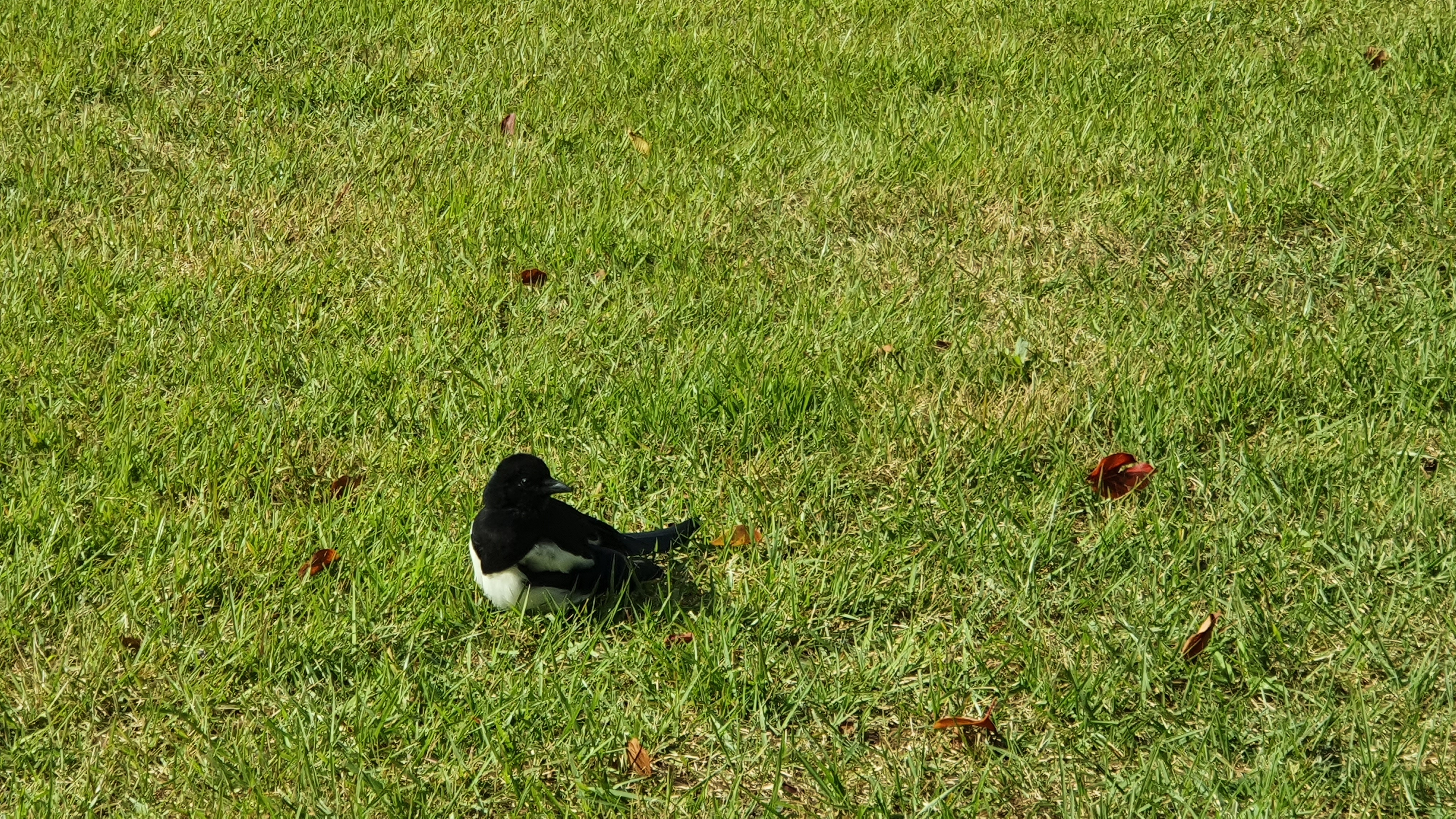 잔디밭에 노곤히 앉아있는 까치를 발견