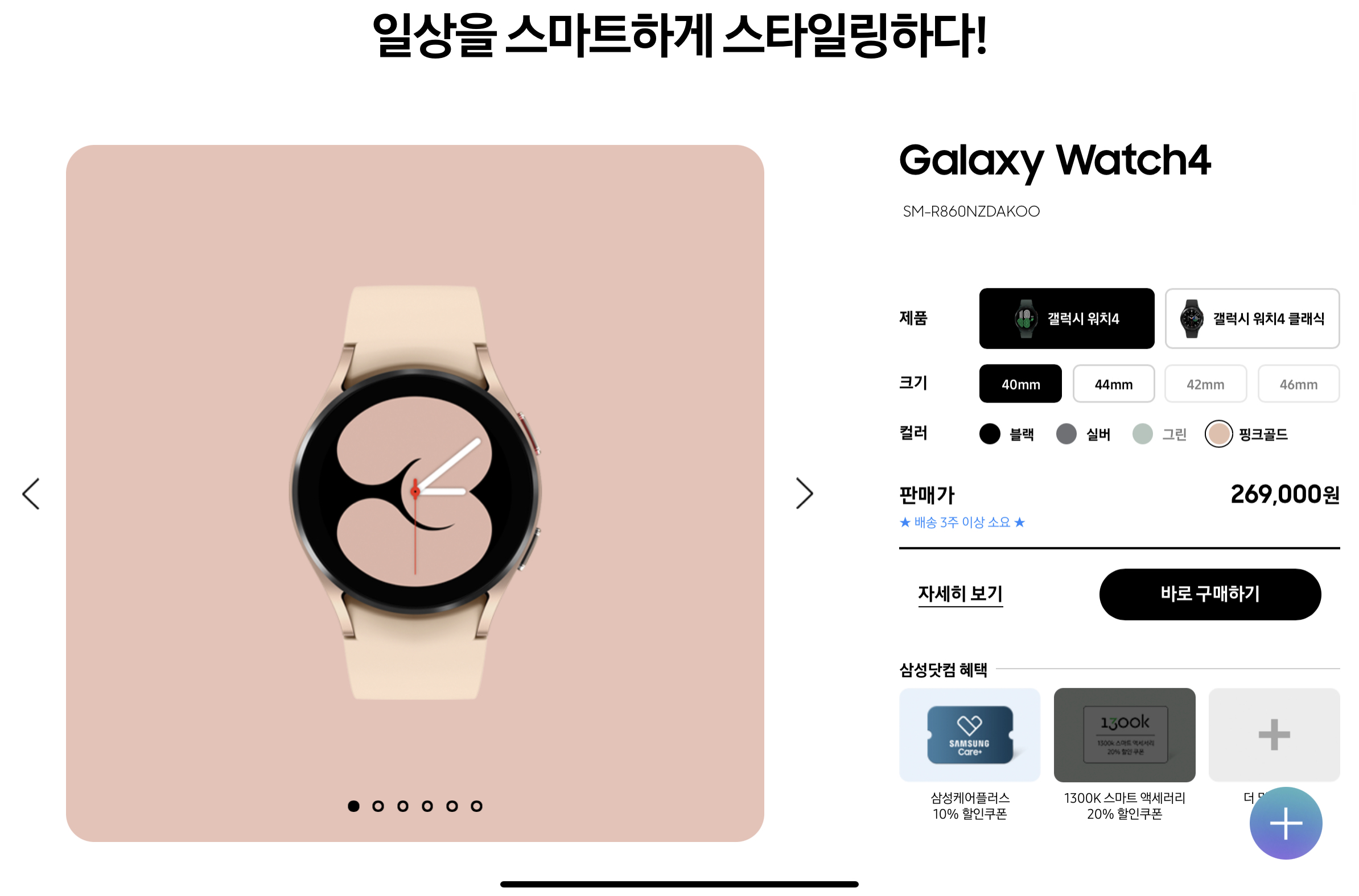- 컬러 : 핑크골드, 실버, 블랙 (40mm) / 그린, 실버, 블랙 (44mm)