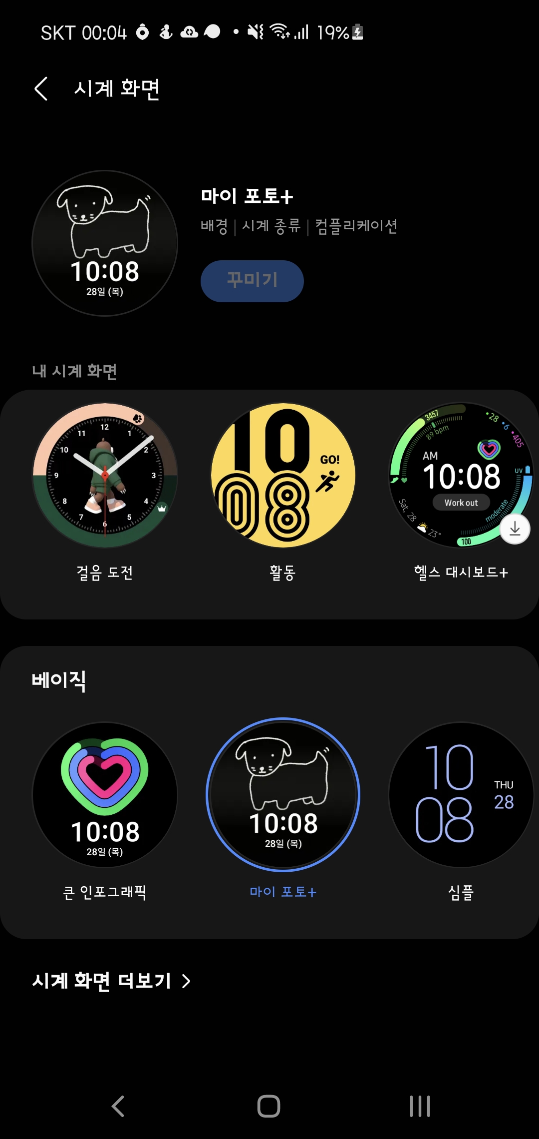시계화면 > 베이직 > 마이포토+ > 꾸미기를 누르고 등록하고 싶은 사진을 등록하면 된다