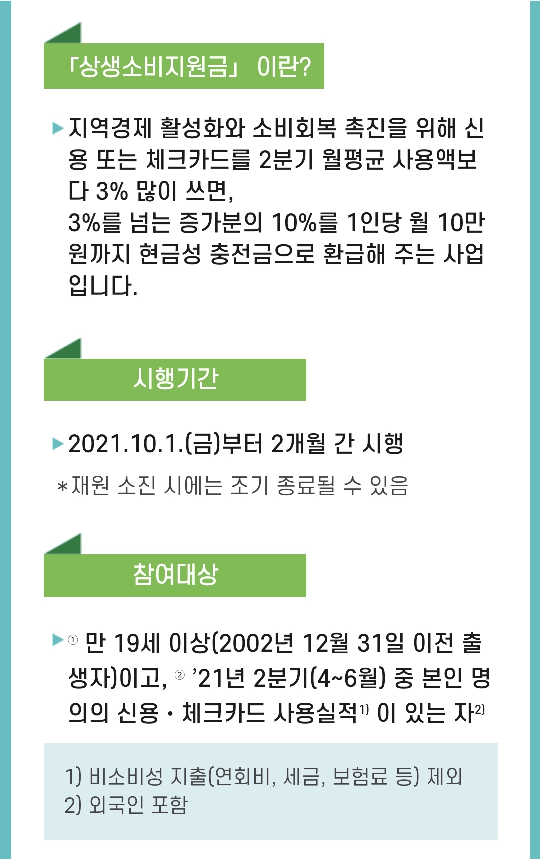 「상생소비지원금」 이란? 지역경제 활성화와 소비회복 촉진을 위해 신용 또는 체크카드를 2분기 월평균 사용액보다 3% 많이 쓰면, 3%를 넘는 증가분의 10%를 1인당 월 10만원까지 현금성 충전금으