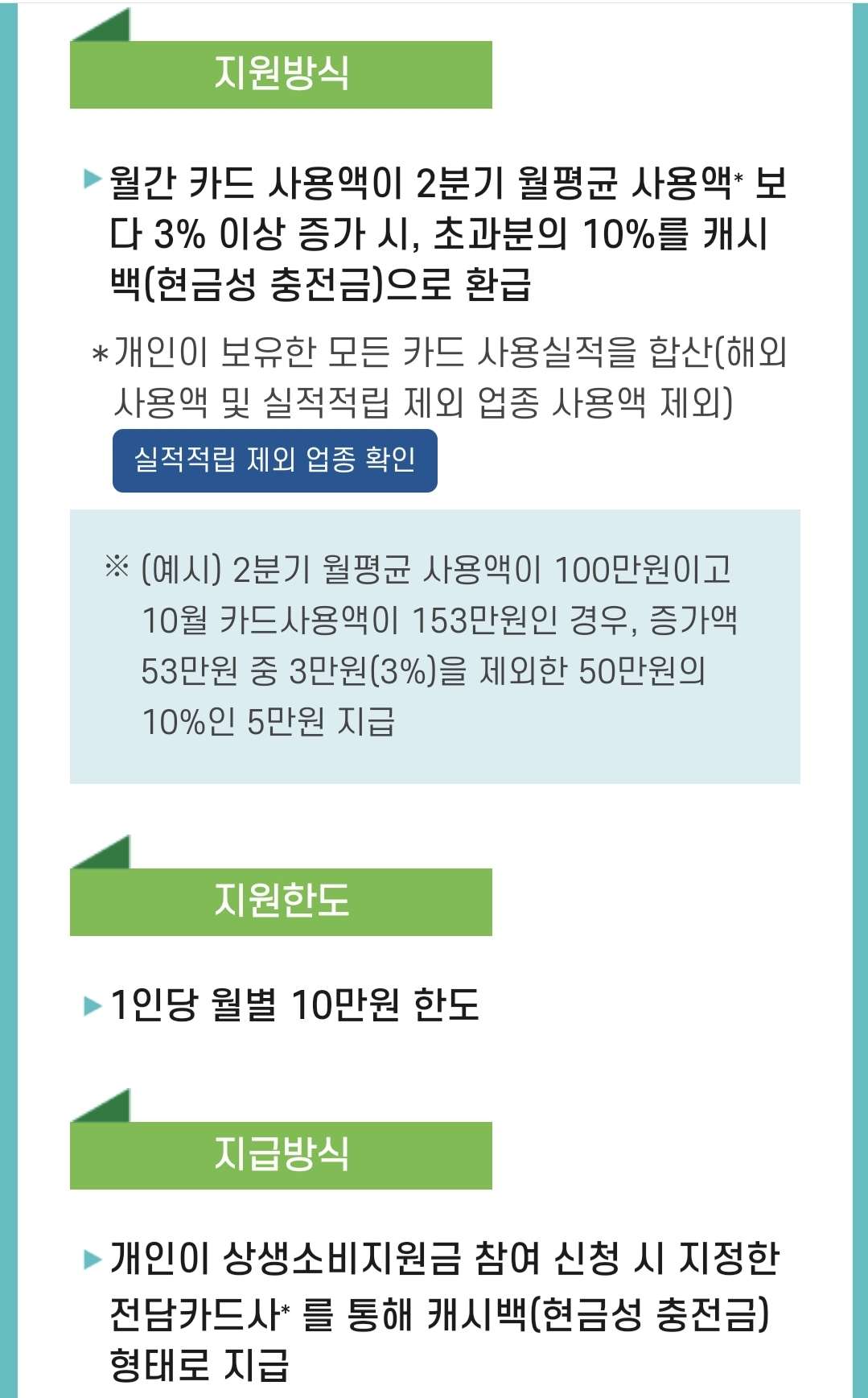 단, 2분기 평균 이용금액 및 10월 이용금액 중 상생 소비지원금 실적 제외 소비처에서 사용한 금액은 인정되지 않음