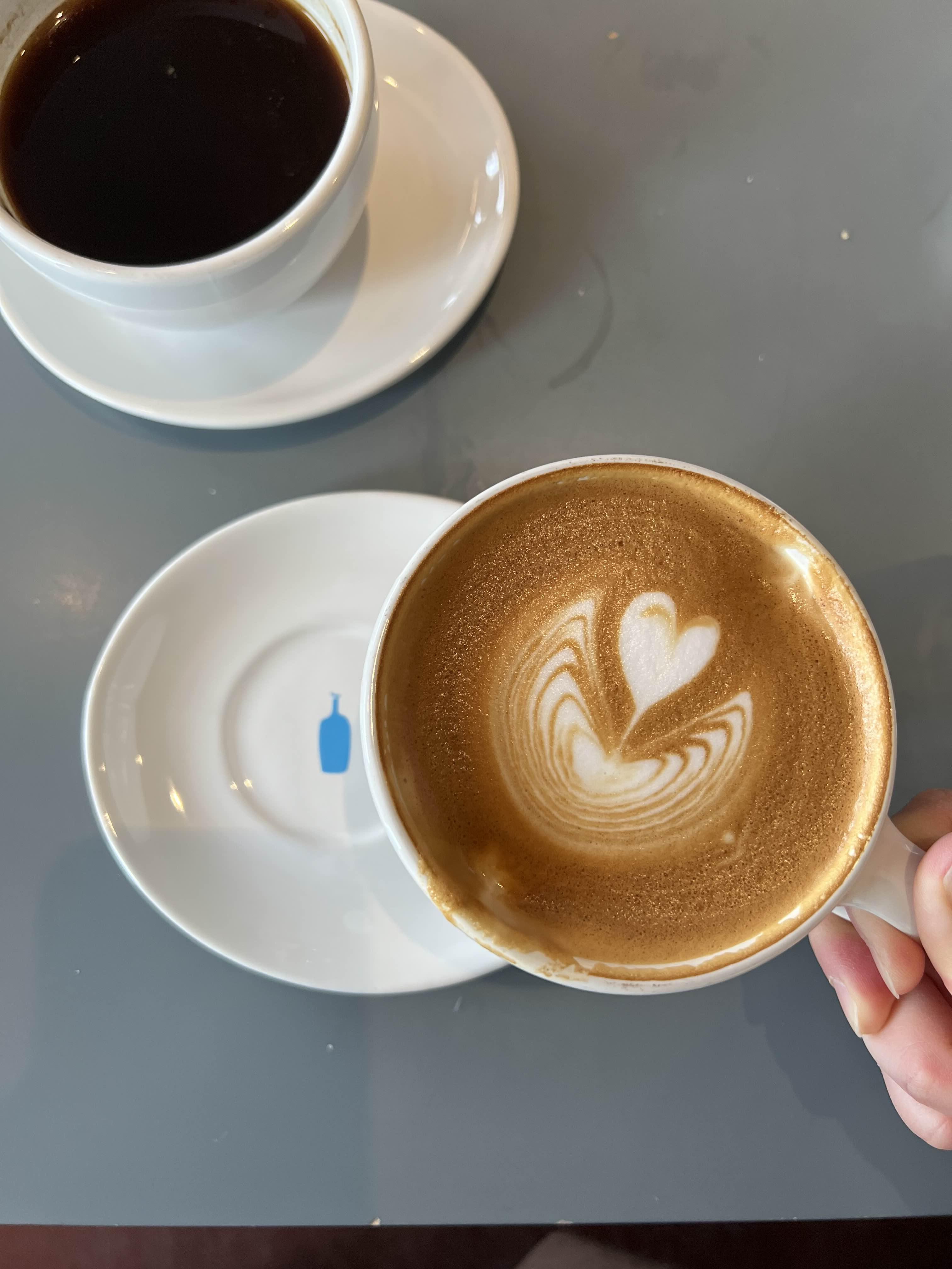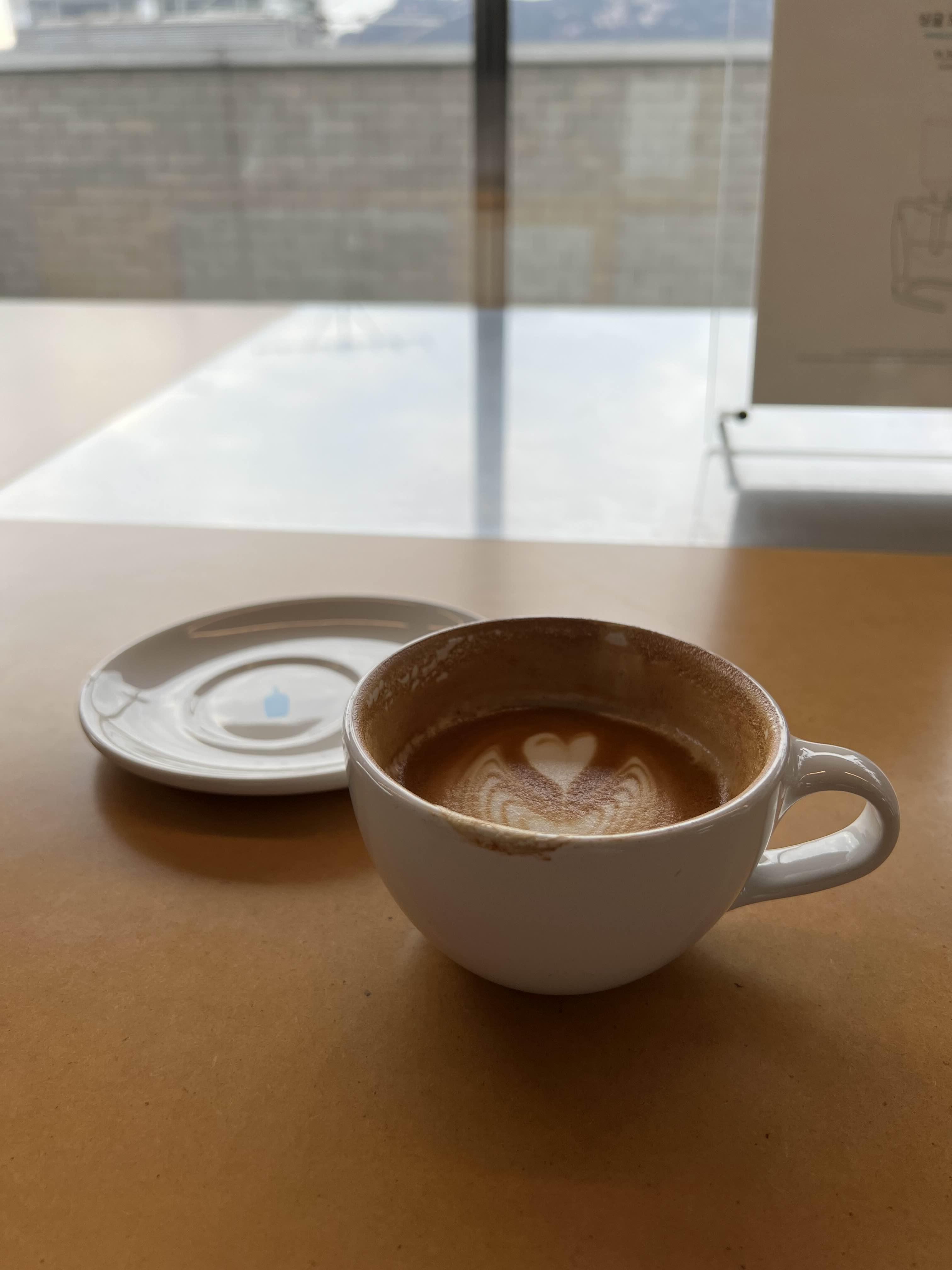 묵직한 컵과 블루보틀 로고가 찍힌 받침이 마음에 든다.