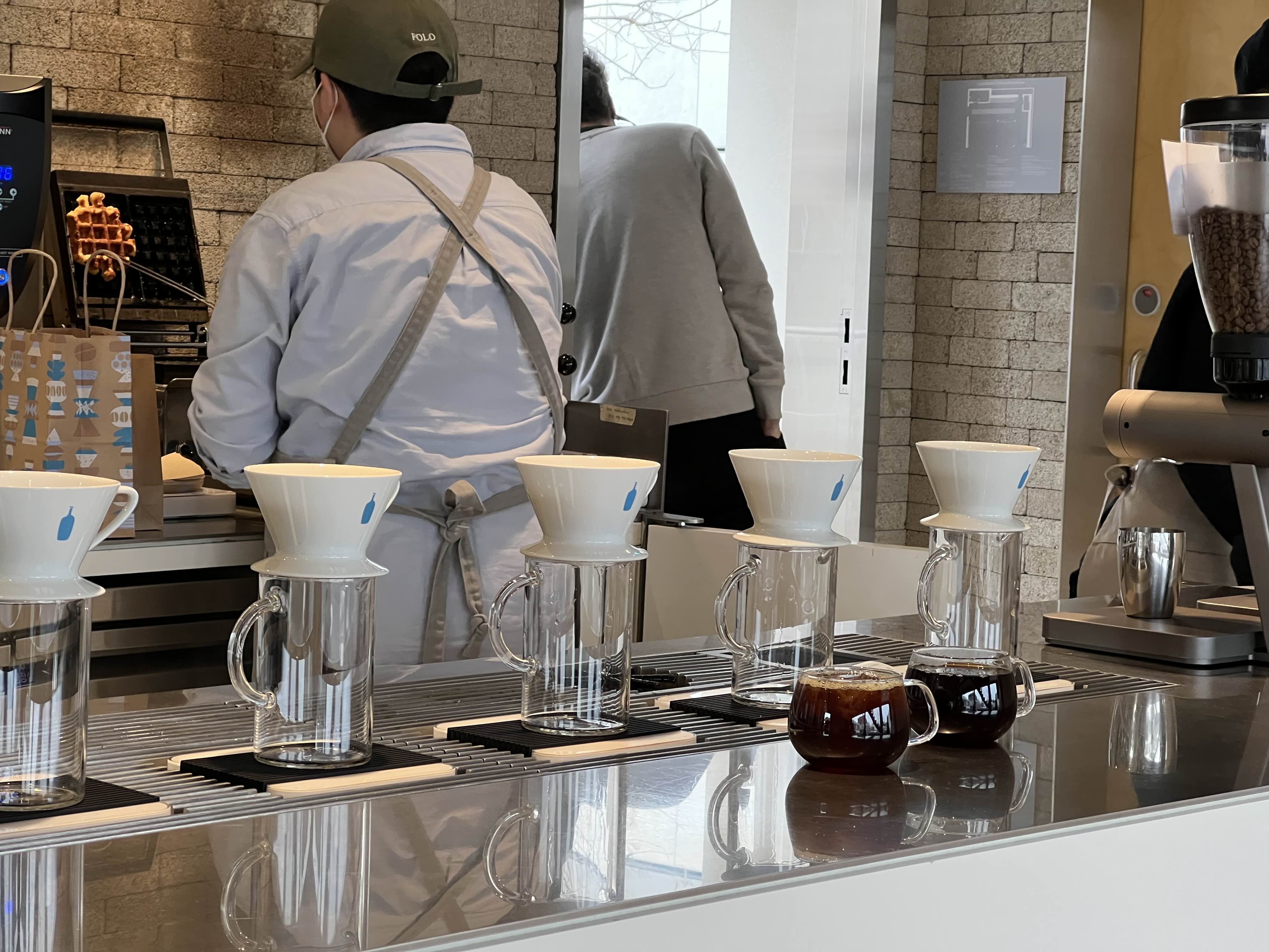 와플 기계에와플이 찍혀있네. 직원이 드리퍼로 핸드드립 커피를 만들어낸다. 한잔 맛보고싶네.