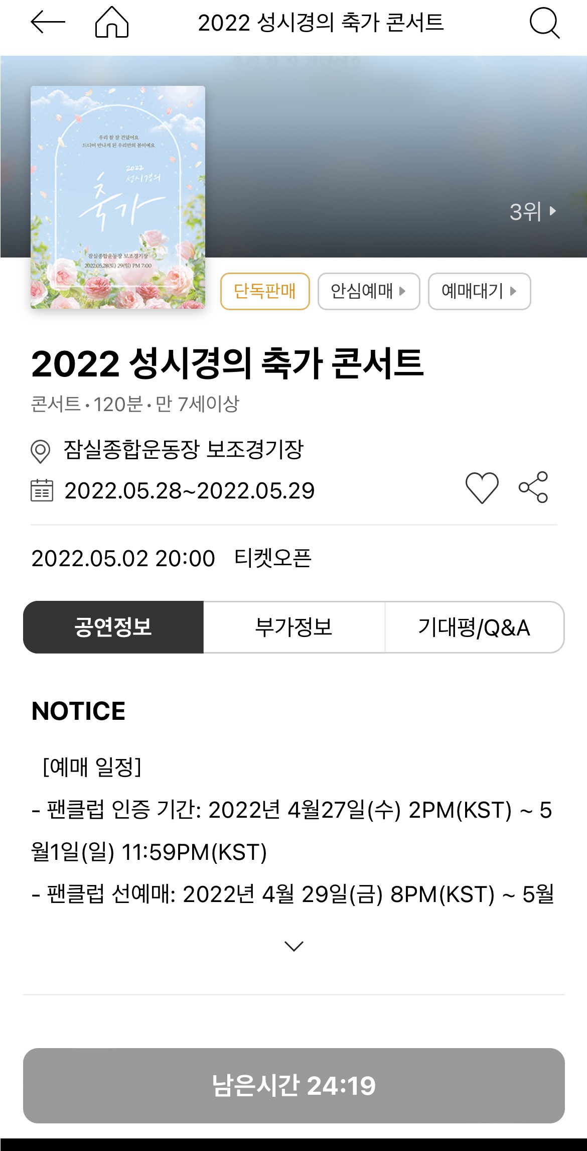 요즘 인터파크를 꾸준히 드나들다가 예매 오픈 시기를 알았고, 30분 전부터 대기하고있었다.