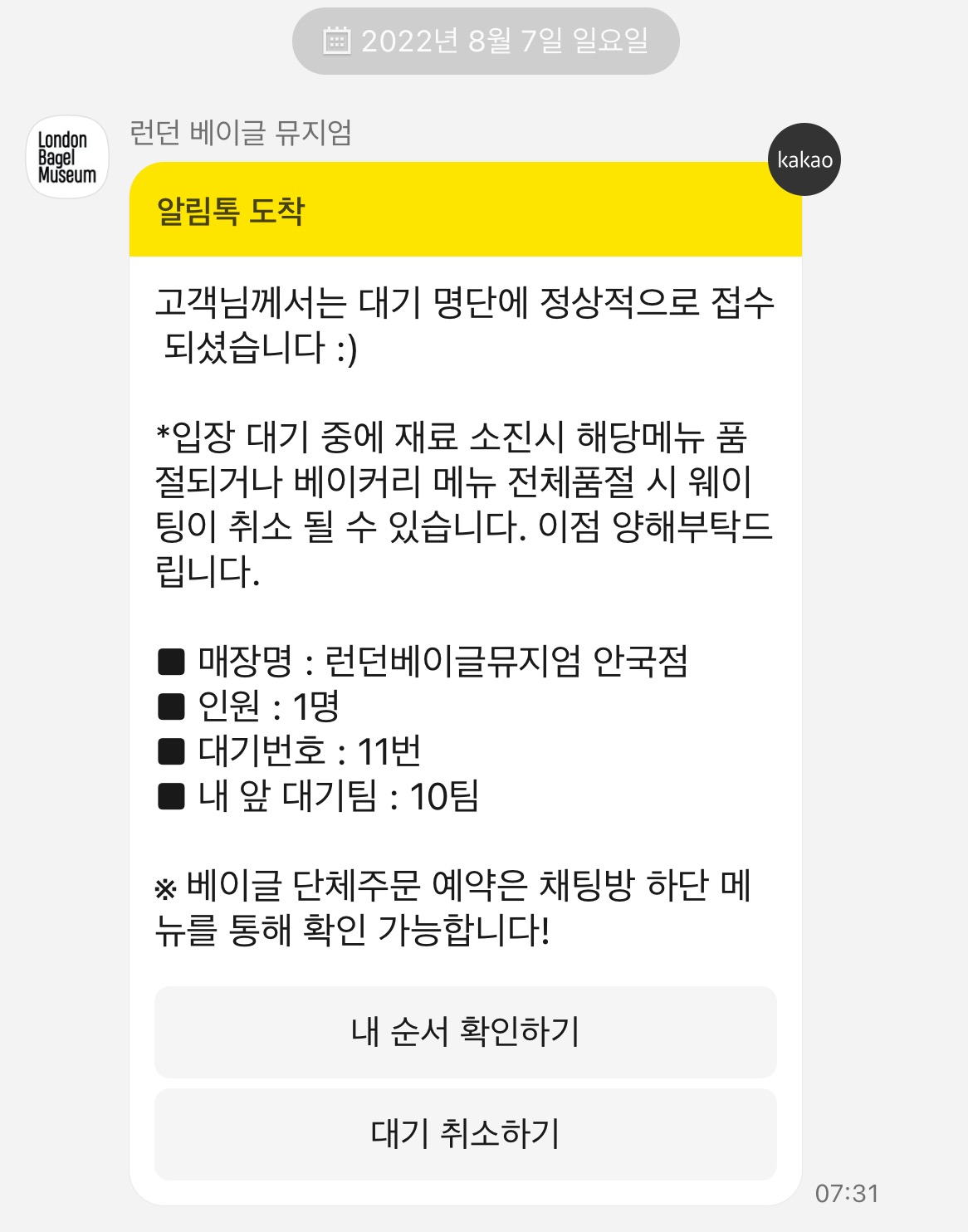 10분 웨이팅 후, 오전 7시 30분부터 매장 앞 태블릿을 이용하여 접수를 할 수 있다.