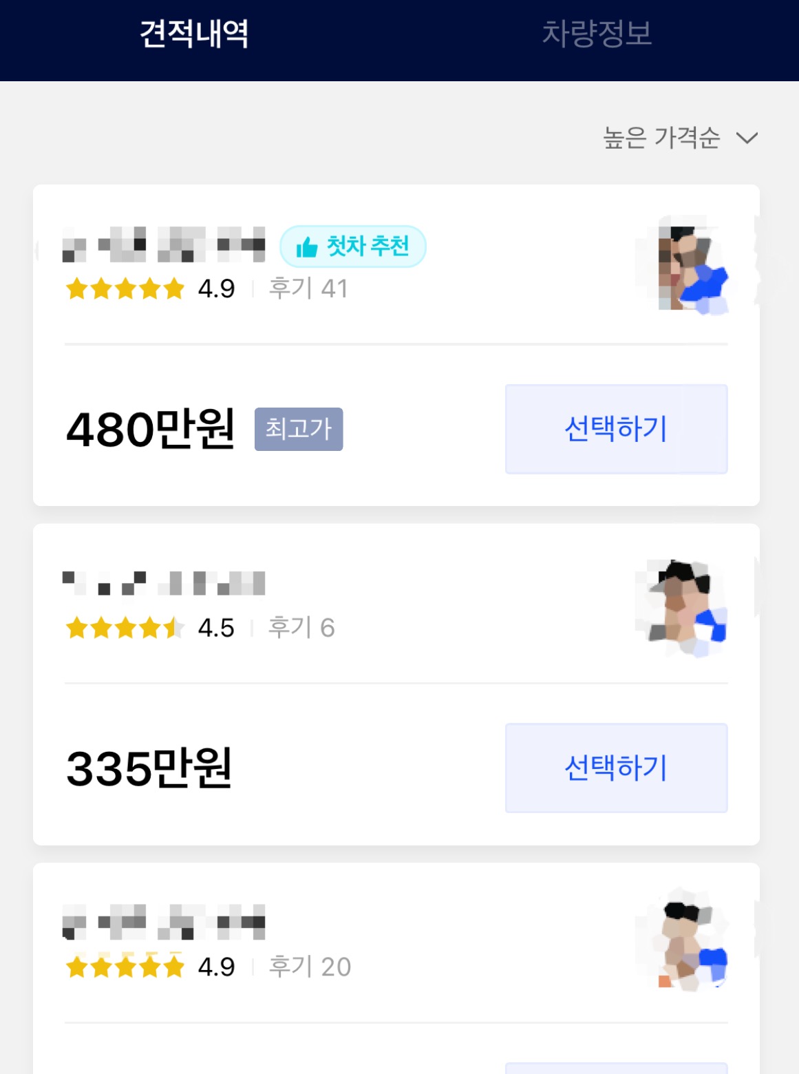 3. 첫차 : 견적가는 가장 높았고, 후기도 좋았던 딜러님이 있었는데 이분께 방문 견적 요청했어야했나? 싶기도 ㅎㅎ
