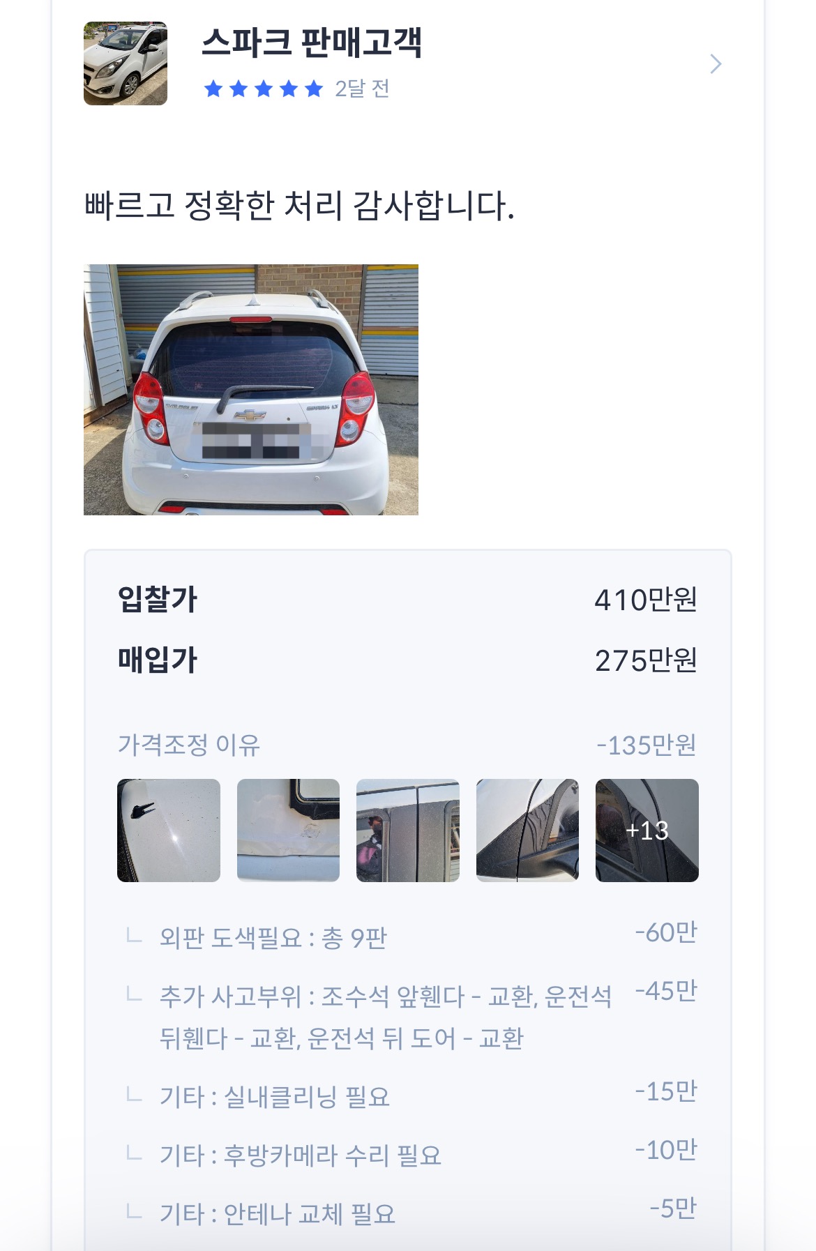 각 딜러 후기를 누르면, 개별 차 별 입찰가 및 매입가응 볼 수 있다. 아래 차는 입찰가는 410만원이었으나 결국 현장에서 저런저러한 사유로 가격조정이 상당부분 된 것을 확인 할 수 있다. 어떤차는 감가 0원도 있으니 딜러별 후기를 참조하어 진행 되는 것이 도움이 될 것이다.
