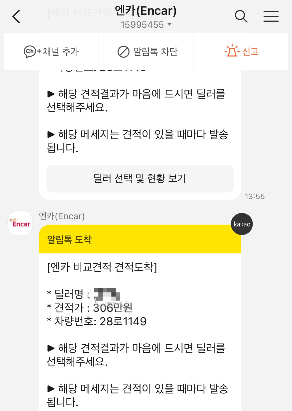 4. 엔카 : 어플에는 등록은 하되, 견적이 카카오톡으로 올라온다. 딜러별 후기는 확인이 어렵다.
