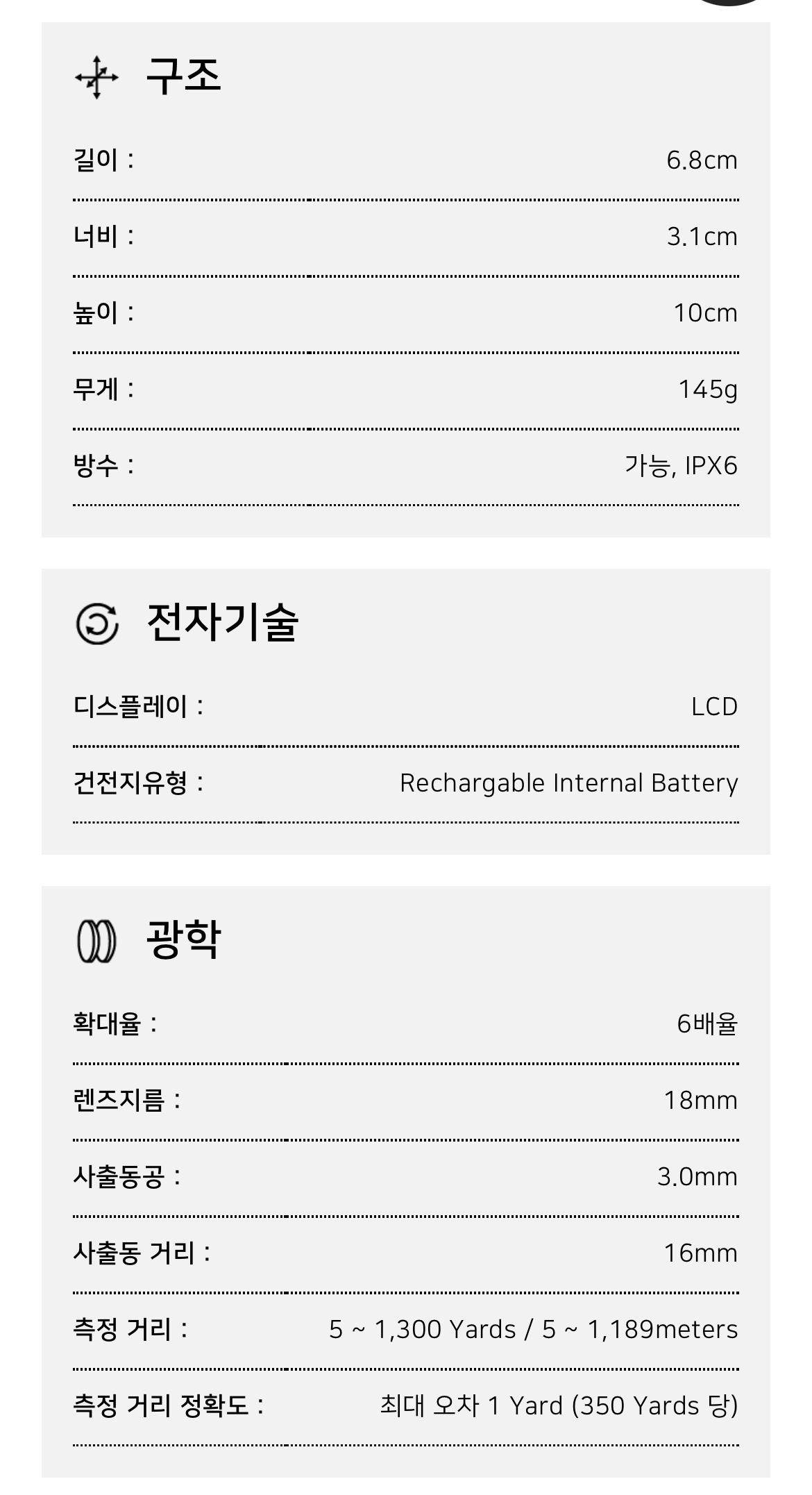 - 기능: 슬로프알고리즘 적용, 6배율, 배터리 충전타입, IPx6