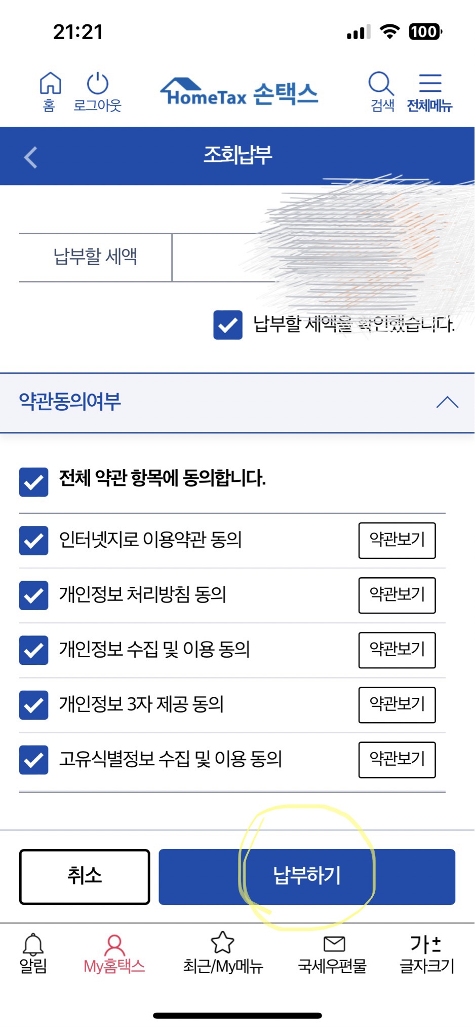 국세는 신용카드 지불 시 0.8%의 수수료가 발생함.