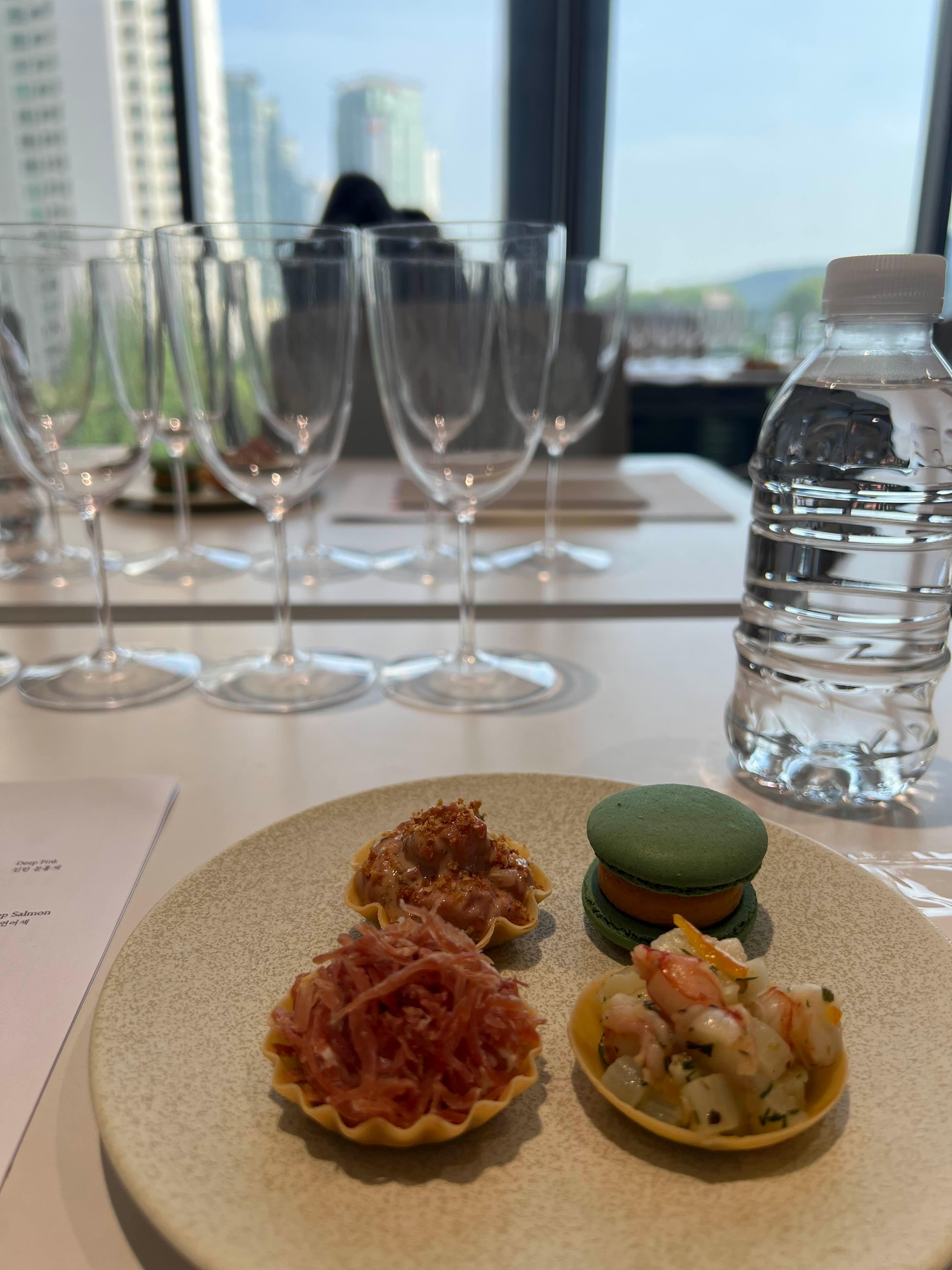2. 와인 잔에 1~5번의 와인을 순서대로 받아 추천받은 핑거푸드와 함께 홀짝.
