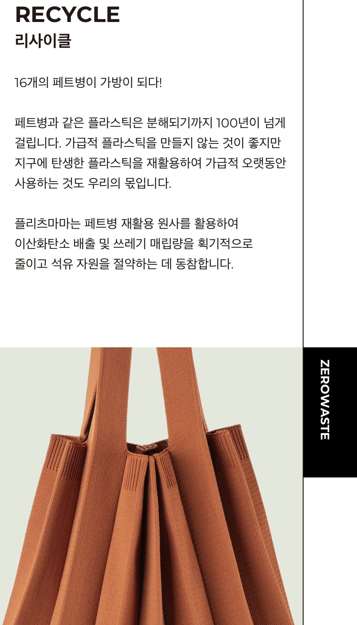 페트병 원사를 활용해서 가방을 만든다는 것이 마음에 드나, 한편으론 가방을 만들면서 또 다른 쓰레기가 나오는 것은 아닌지에 대한 의구심도 든다. (그렇다고 쓰레기를 제로로 한다는것은 불가능할테지만…)
